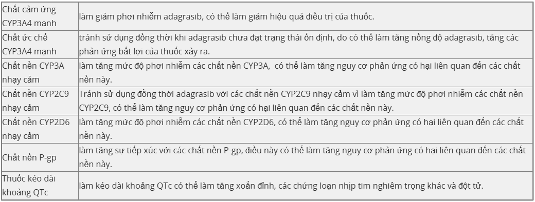 - Thải trừ: thuốc thải trừ chủ yếu qua phân khoảng 75%, trong nước tiểu khoảng 4,5%. Thời gian bán thải của Adagrasib khoảng 23 giờ. Độ thanh thải của Adagrasib là 37 L/h.