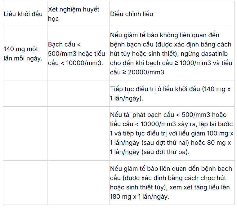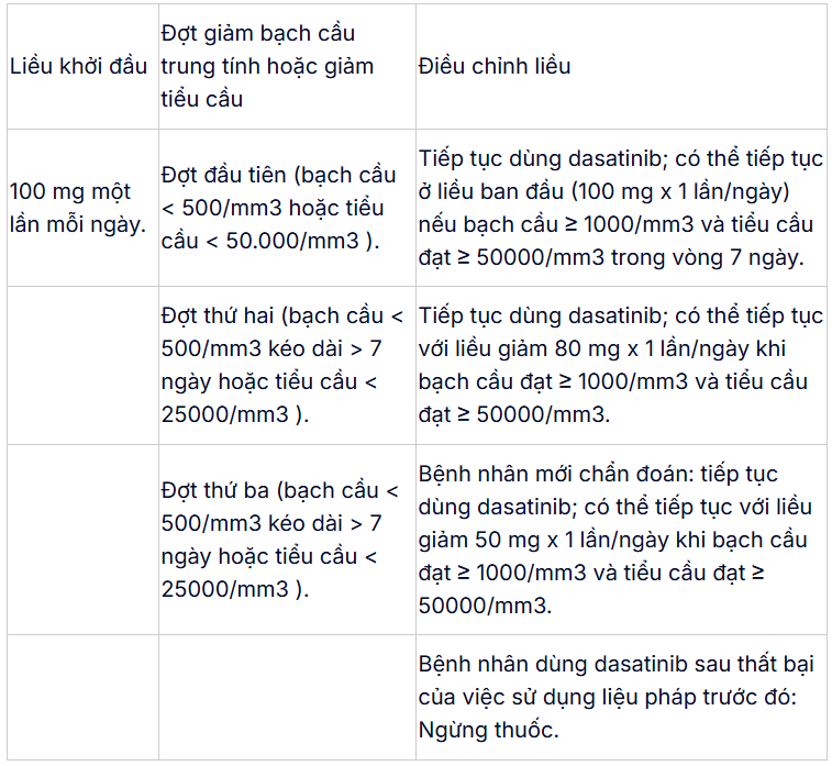 - Điều chỉnh liều khi xảy ra độc tính: Nếu xảy ra độc tính trên hệ tạo máu, ngưng tạm thời dasatinib, giảm liều hoặc ngưng thuốc.
