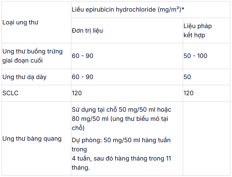 - Nếu dùng epirubicin đơn trị thì liều thường dùng là 60 - 90 mg/m2 tiêm một lần; lặp lại sau 3 tuần; có thể chia liều này cho 2 - 3 ngày nếu cần. Để điều trị ung thư giai đoạn cuối, dùng 12,5 - 25 mg/m2, tuần 1 lần.