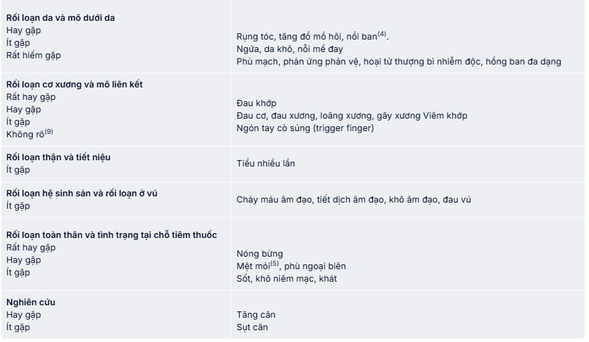 Các phản ứng phụ được xếp loại theo đề mục về tần suất, đầu tiên là hay gặp nhất, sử dụng quy ước sau đây: rất hay gặp (> 1/10), hay gặp (> 1/100, < 1/10), ít gặp (> 1/1000, < 1/100), hiếm gặp (> 1/10.000, < 1/1000), rất hiếm gặp (< 1/10.000), bao gồm cả các báo cáo lẻ tẻ.