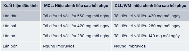 Nên tạm ngừng điều trị với Ibrutix khi có bất kỳ khởi phát mới hoặc tiến triển xấu đi của độc tính không phải huyết học độ ≥ 3, giảm bạch cầu trung tính có nhiễm trùng hoặc sốt ≥ độ 3, hoặc độc tính huyết học độ 4. Khi triệu chứng độc tính được giải quyết về độ 1 hoặc độ ban đầu (phục hồi) thì có thể tái điều trị Ibrutix với liều khởi đầu. Nếu độc tính tái phát, liều một lần mỗi ngày nên giảm đi một viên (140 mg). Nếu cần thiết nên cân nhắc giảm thêm một viên 140 mg. Ngừng điều trị nếu độc tính còn dai dẳng hoặc tái phát sau hai lần giảm liều.