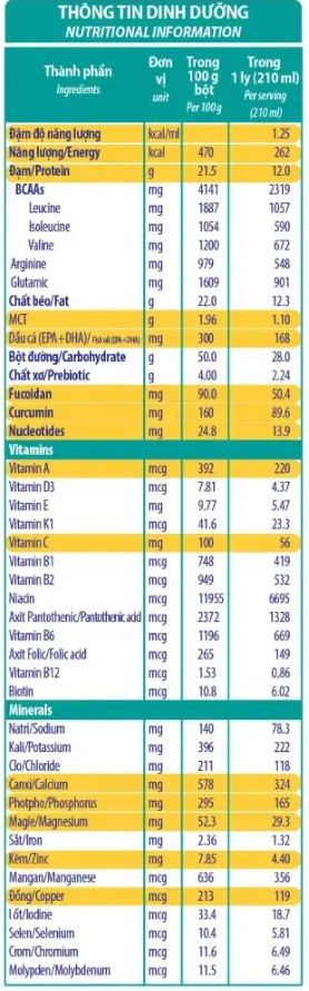 - Đặc biệt bổ sung tinh chất nghệ Nano Curcumin hỗ trợ giảm viêm, kết hợp với Vitamin C, Sắt, Kẽm, Đồng giúp nhanh lành vết mổ sau phẫu thuật.