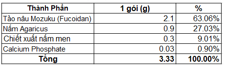 Fucoidan chiết xuất tinh khiết từ tảo nâu Mozuku Okinawa, nấm Agaricus, β-Glucan, Lecithin (trong đậu nành), Dextrin, Canxi Photphat.