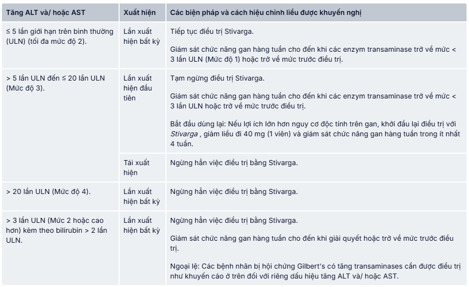 Đối với những bệnh nhân có xét nghiệm chức năng gan xấu đi có thể do điều trị bằng Stivarga (ví dụ khi không có nguyên nhân nào khác rõ ràng, như tắc mật sau gan hoặc tiến triển của bệnh), cần tuân thủ việc điều chỉnh liều và những lời khuyên về giám sát trong Bảng 2 (xem phần “Liều dùng và cách dùng” - mục Hiệu chỉnh liều”).