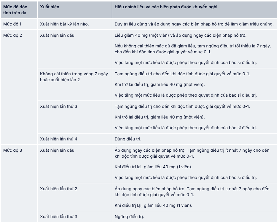 Bảng 1: Hiệu chỉnh liều và các biện pháp được khuyến nghị đối với hội chứng tay- chân (HFSR).