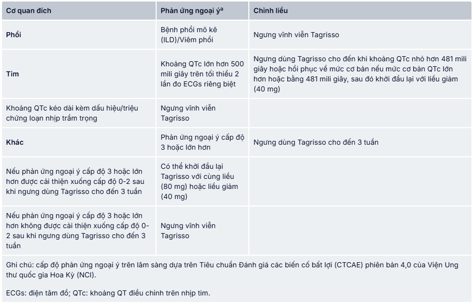 Khi có thể, nên tránh dùng Tagrisso trên bệnh nhân có hội chứng QT kéo dài bẩm sinh. Nên theo dõi định kỳ điện tâm đồ (ECGs) và chất điện giải trên bệnh nhân suy tim sung huyết, rối loạn điện giải hoặc ở bệnh nhân đang dùng thuốc đã biết làm kéo dài khoảng QTc. Nên ngưng điều trị ở bệnh nhân có khoảng QTc lớn hơn 500 mili giây được ghi nhận trên ít nhất 2 lần đo điện tâm đồ tách biệt cho đến khi khoảng QTc nhỏ hơn 481 mili giây hoặc phục hồi về trị số căn bản nếu khoảng QTc lớn hơn hoặc bằng 481 mili giây, sau đó có thể dùng lại Tagrisso ở mức liều giảm như trình bày tại Bảng 4. Nên ngưng Tagrisso vĩnh viễn ở bệnh nhân có khoảng QTc kéo dài đi kèm với các biến cố sau: xoắn đỉnh, nhịp nhanh thất đa dạng, có dấu hiệu/ triệu chứng loạn nhịp trầm trọng.