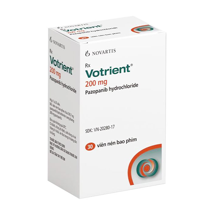 Thuốc Votrient 200mg Novartis có hoạt chất là Pazopanib được dùng trong các trường hợp điều trị ung thư biểu mô tế bào thận (RCC), sarcom phần mềm (STS). Thuốc chỉ nên dùng khi có chỉ định từ bác sĩ.